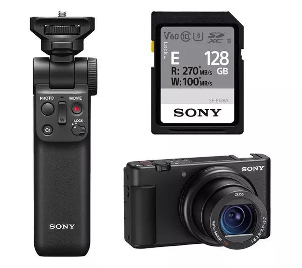 SONY ZV-1 High Performance Compact Vlogging Camera, GP-VPT2BT Shooting Grip & SD Card Bundle